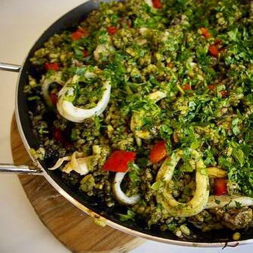 今月は春の洋食メニュー。イカ墨のパエリアをつくります。